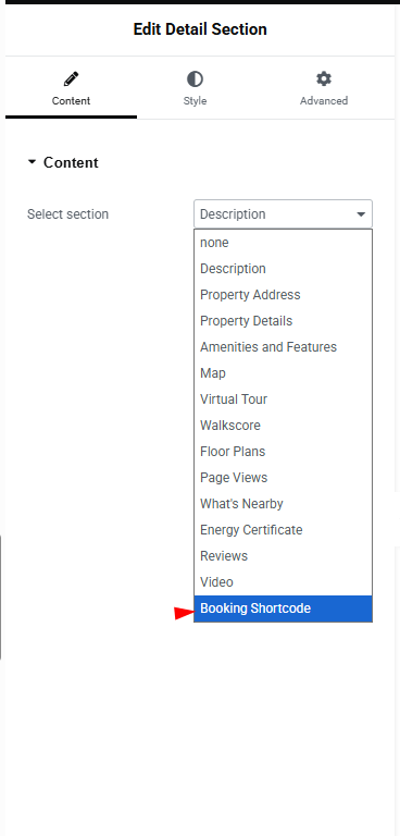 5. From the widget dropdown options, select Booking Shortcode
