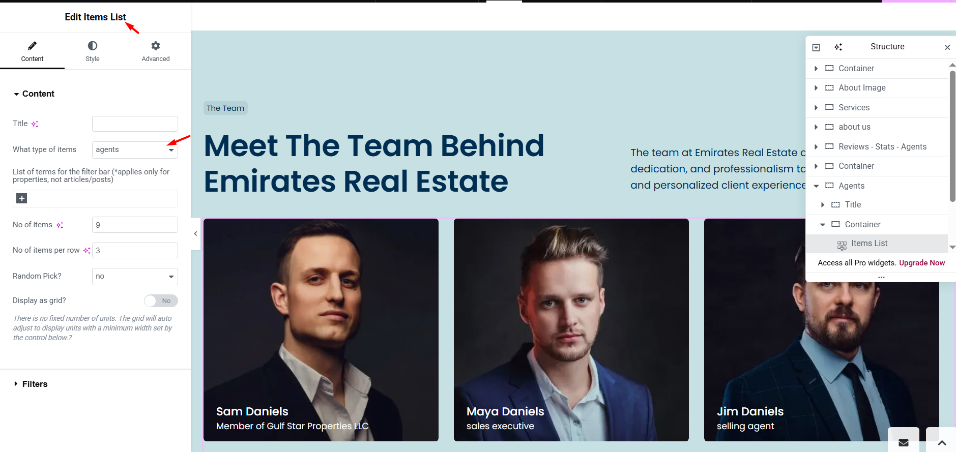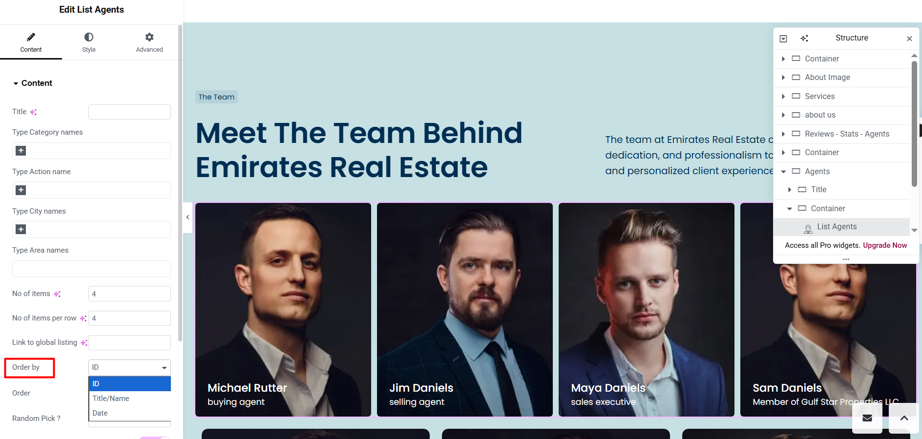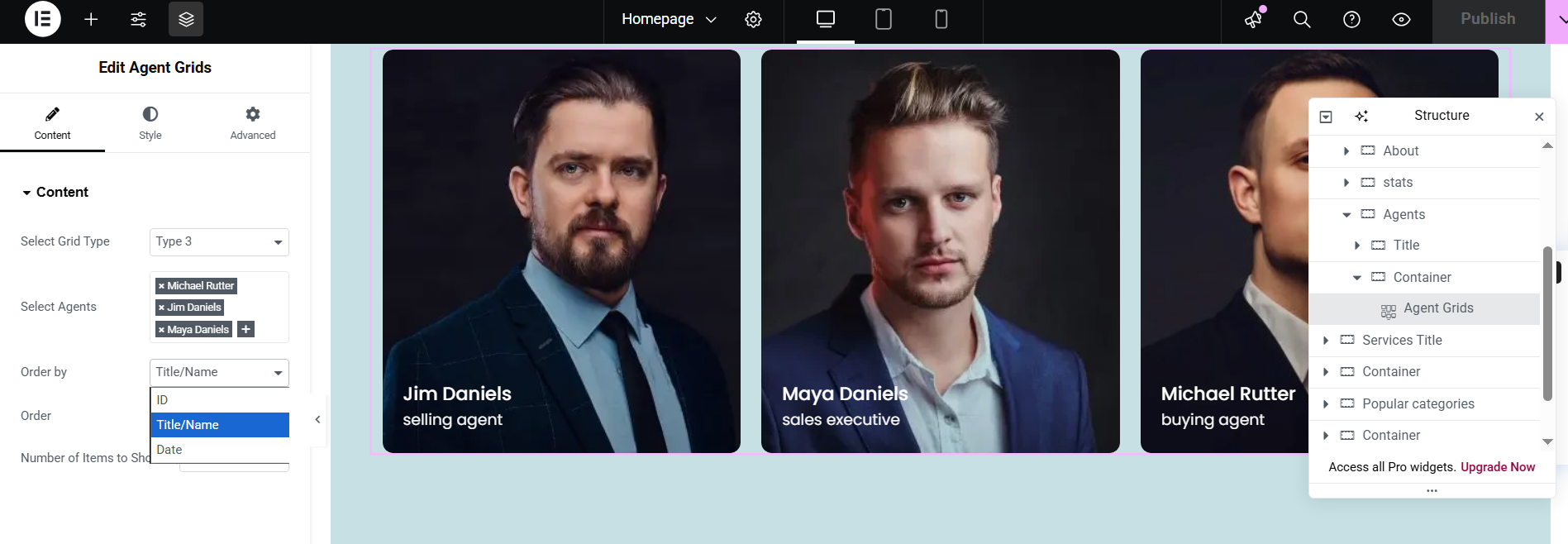The Agents Grid widget displays agents in a grid layout. This widget is only available for Elementor Builder (free)