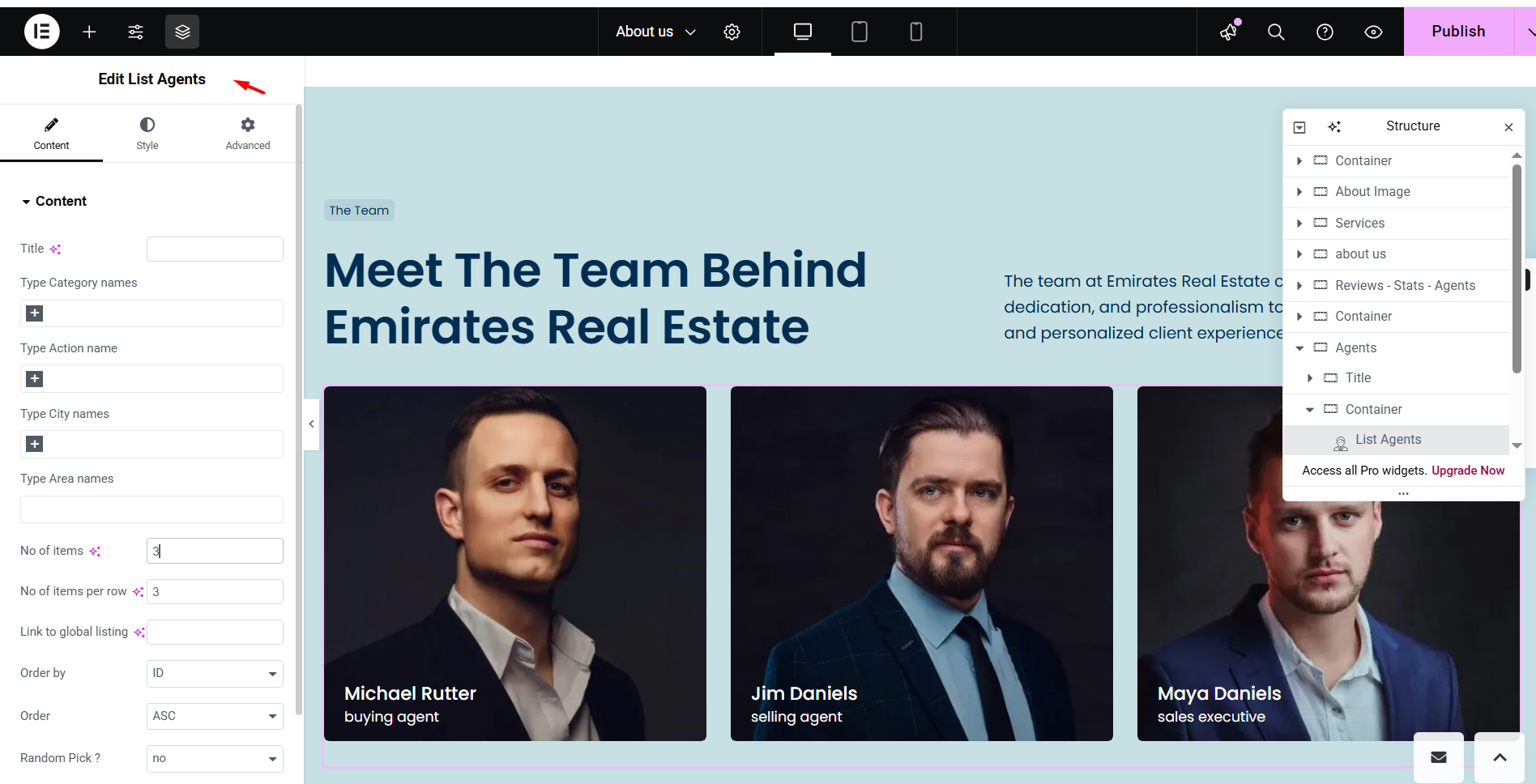 The List Agents widget shows agents in a vertical list format. This widget is available for Elementor only.