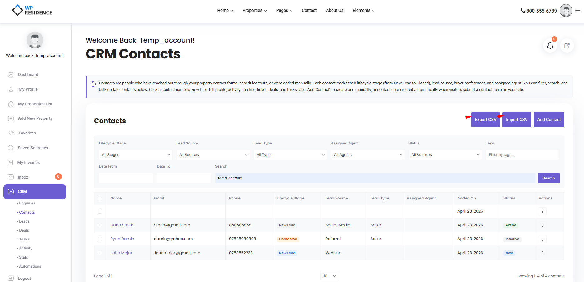The WPResidence real estate CRM supports CSV import and export for contacts, leads, enquiries, deals, and tasks. Bring in a spreadsheet of existing contacts, or pull your CRM into a spreadsheet for analysis — both paths work.