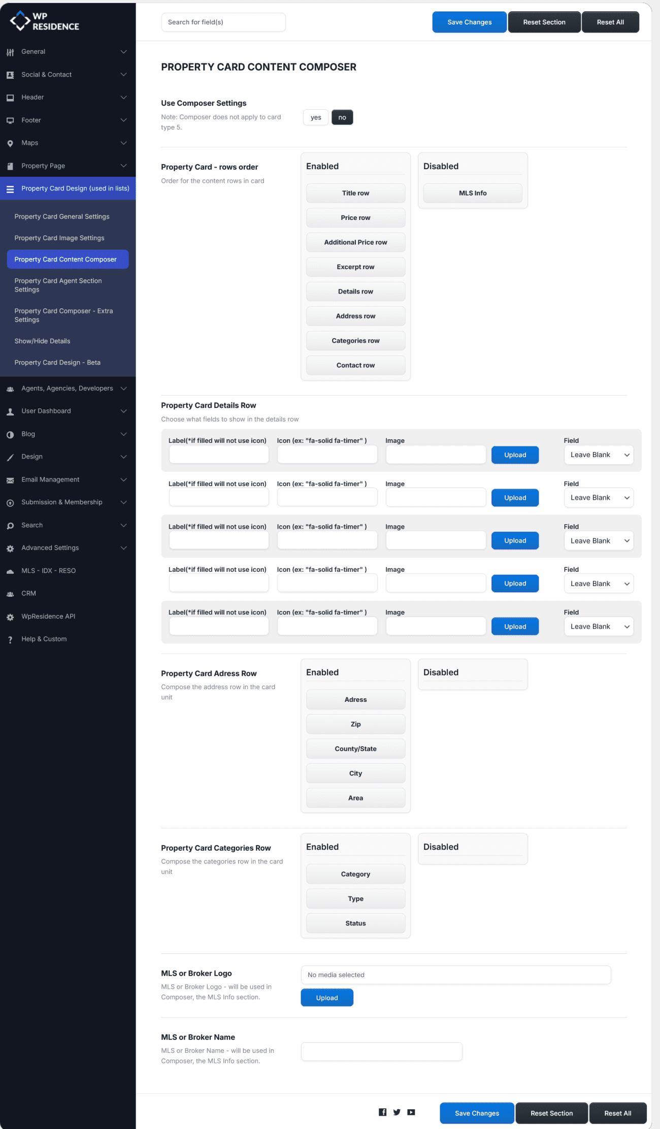 This section focuses on the content displayed within your property cards. You can manage which details are shown, such as property features, price, location, and any custom fields you’ve added. The content composer allows for flexibility in presenting this data.