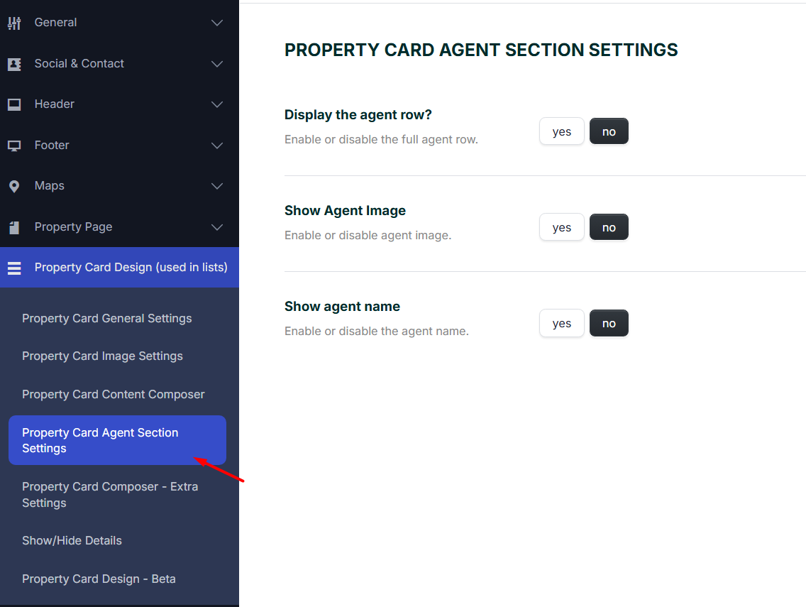 These options allow you to control the visibility of the agent information row displayed on each property card (used in lists like search results, taxonomy pages.