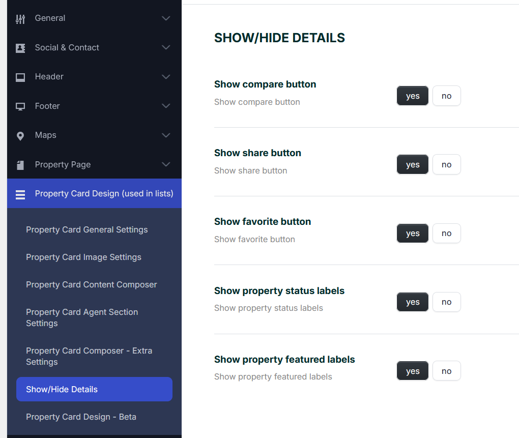 Learn how to show or hide specific details on the property card, such as the compare, share, or favorite buttons. This section allows you to toggle the visibility of certain elements based on your needs.