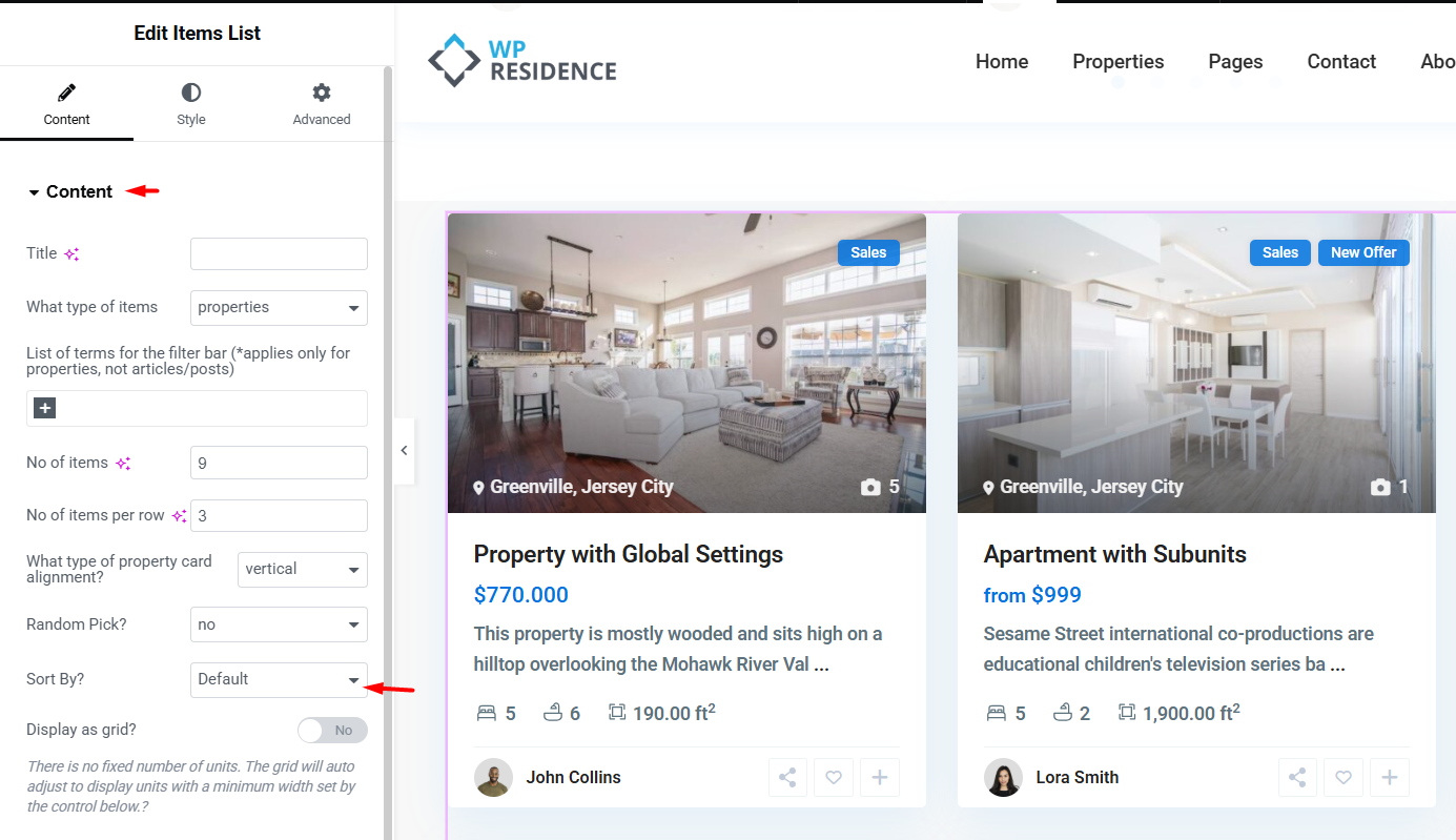 When a property list uses the Default sort option, the theme will show featured properties first. After all featured properties are displayed, the remaining properties are shown by ID.