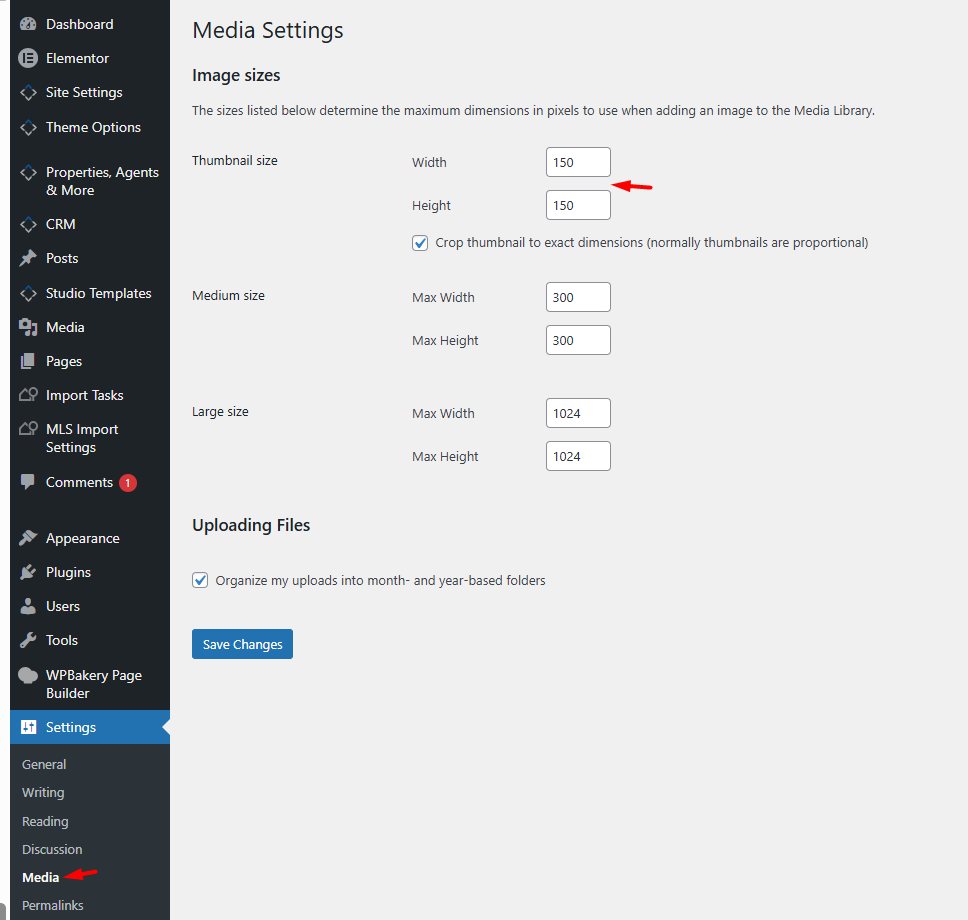 • Do not set WordPress image sizes to 0 if you want property image previews to display.