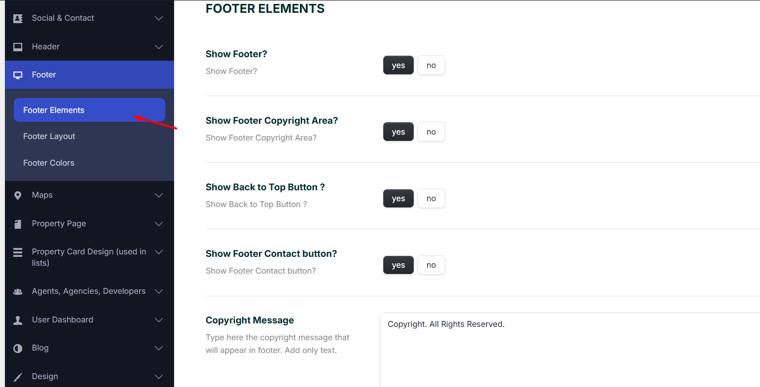 - Type the copyright message that will appear in the footer in the Copyright Message option. The copyright message supports only TEXT, not links (HTML is stripped for security reasons).