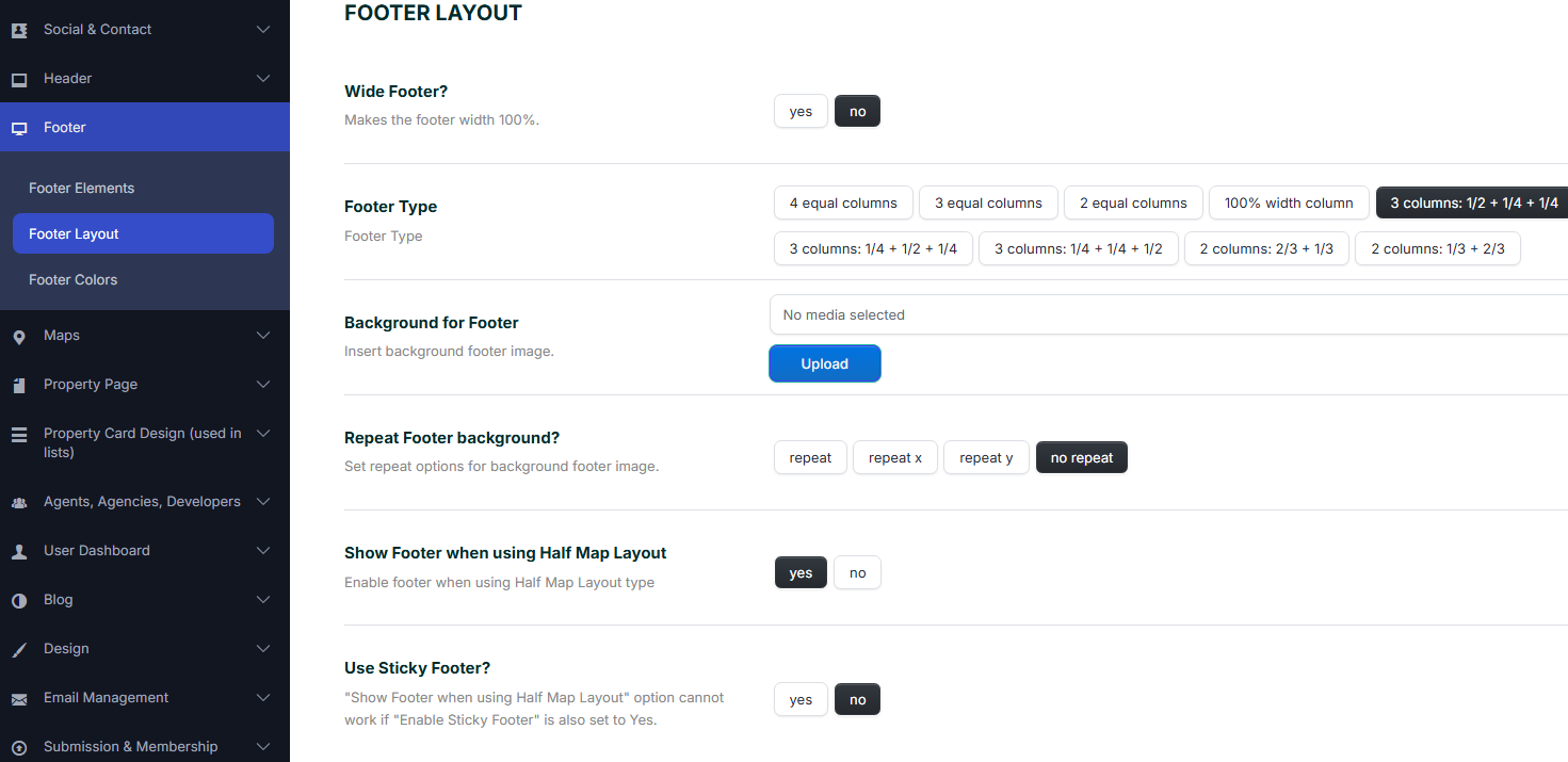 Important: The “Show Footer when Using Half Map Layout” option does not work if “Enable Sticky Footer” is also set to Yes.