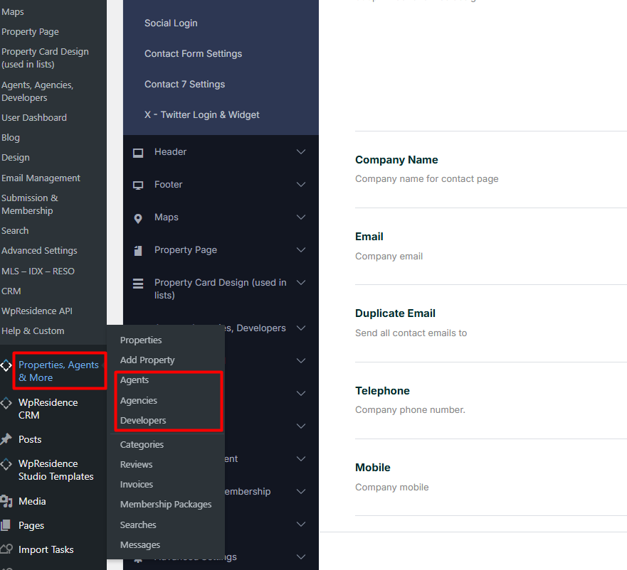 - Create agents, agencies, and developers manually from Wp-admin Dashboard.