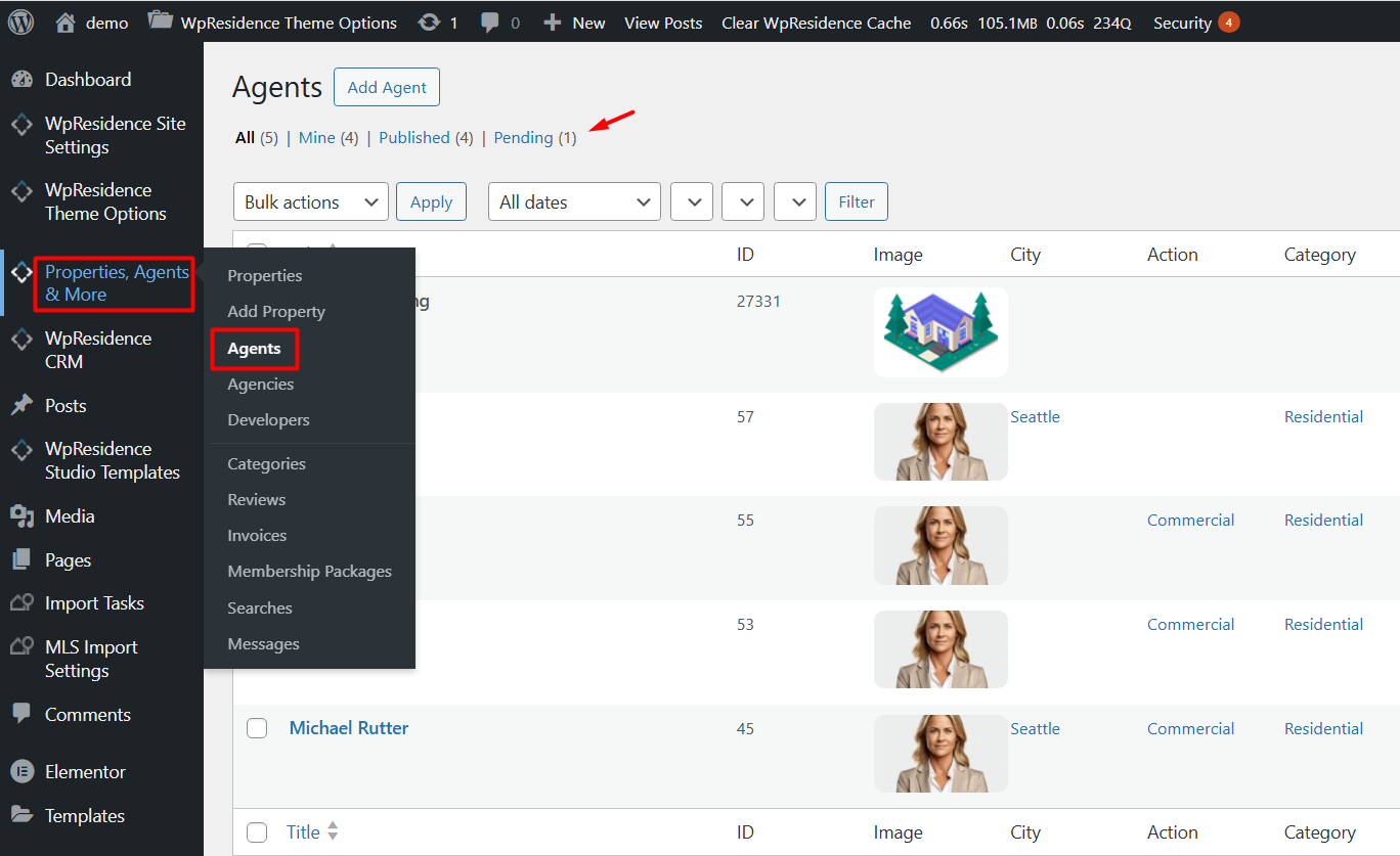 - Admin receives and email about the new account and he sees pending accounts under Agents / Agencies / Developers in Wp-admin.