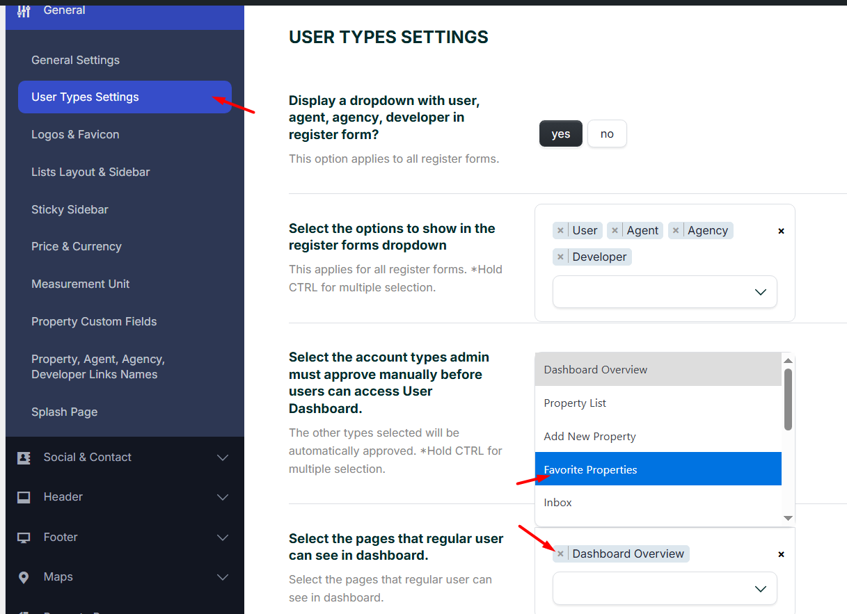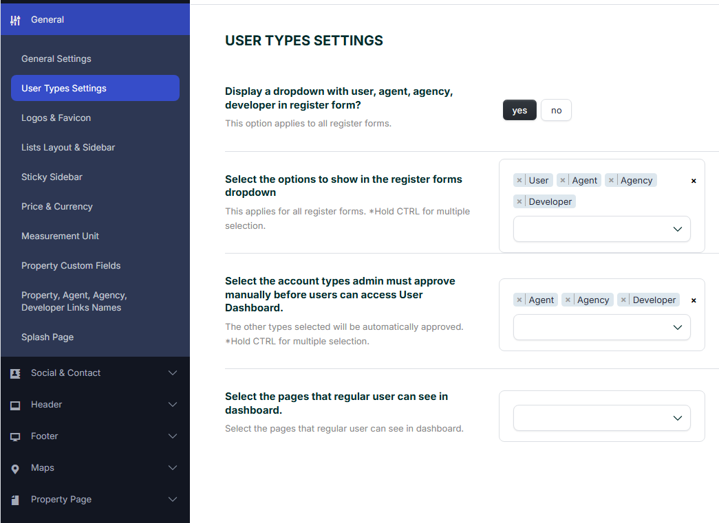- OR allow users to register as regular user, agent, agency, or developer from Theme Options → General → User Role Settings