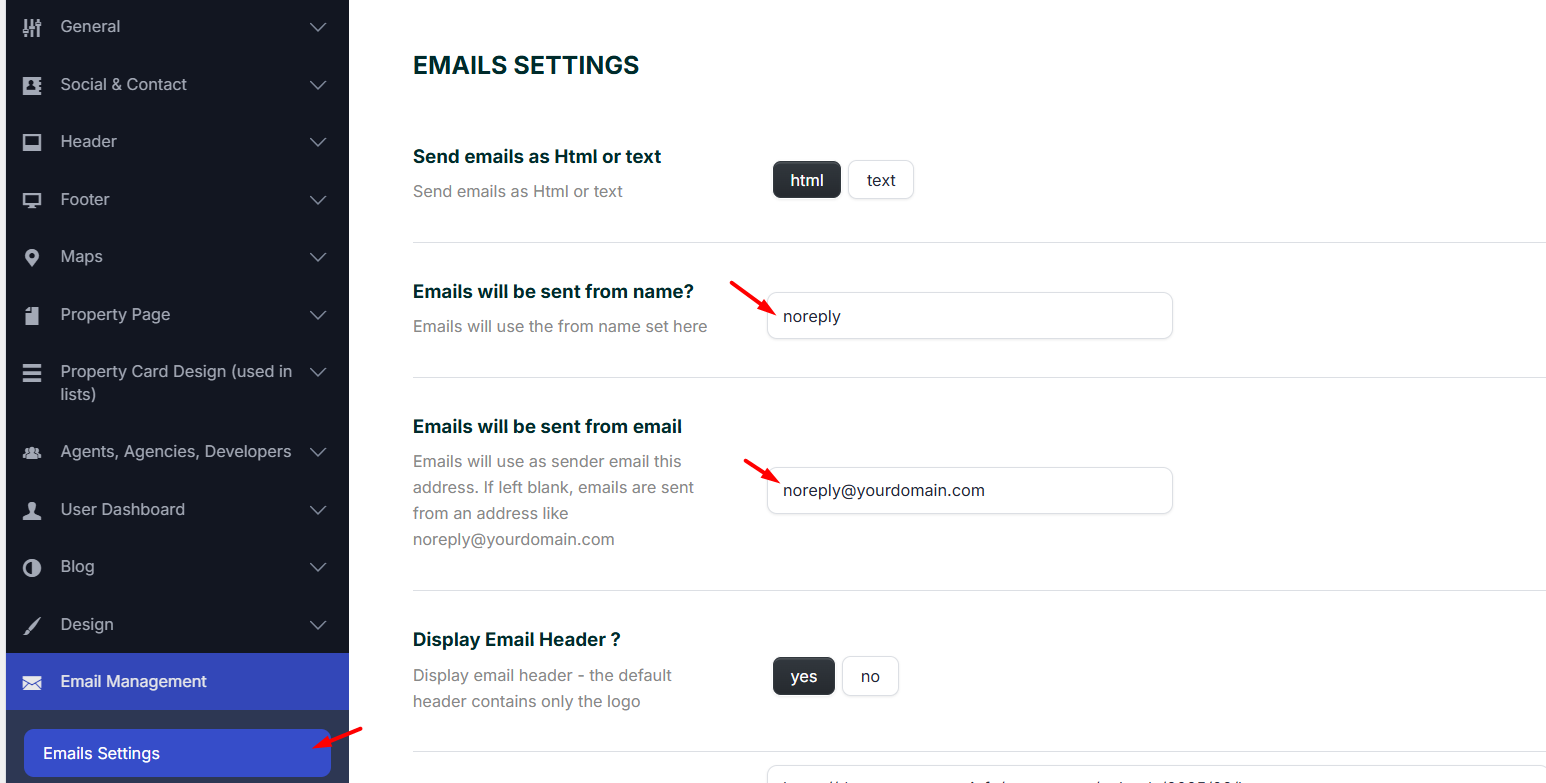These settings control the sender identity used by WPResidence when the theme sends emails.