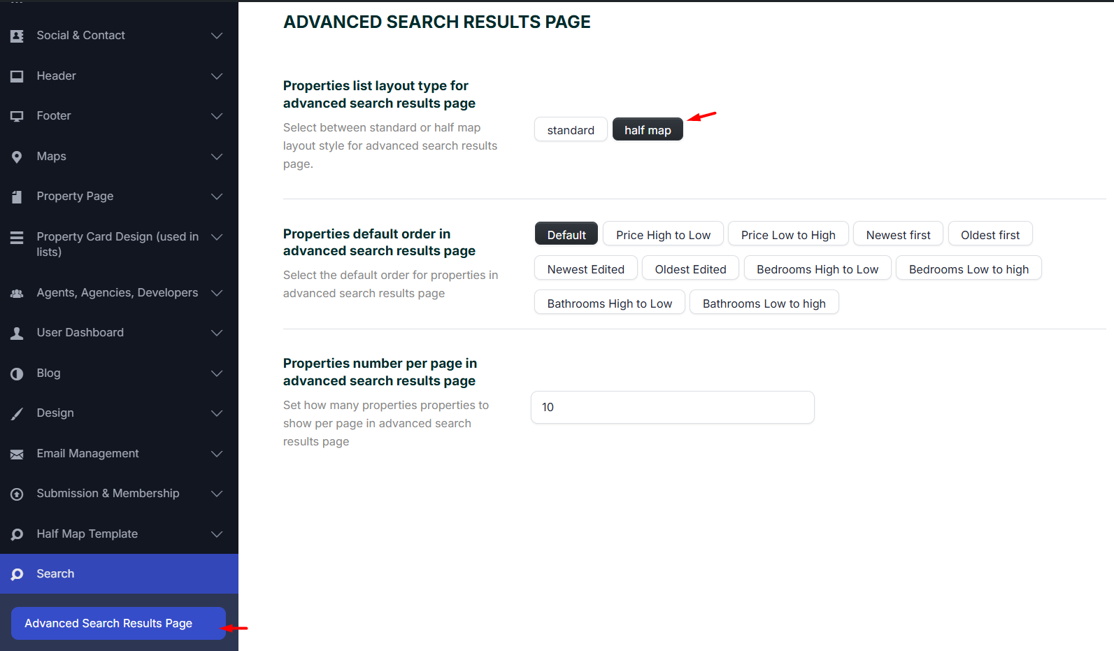 The Half Map Template options control how the Advanced Search Results – Half Map page is displayed. These settings affect layout and presentation only.