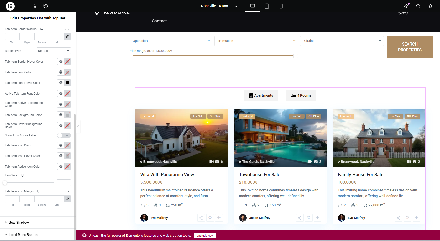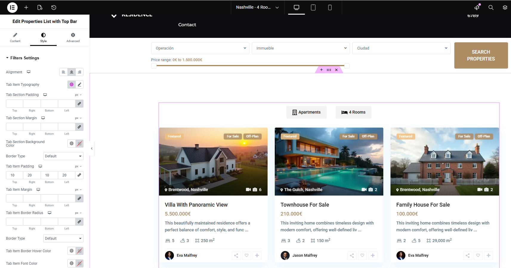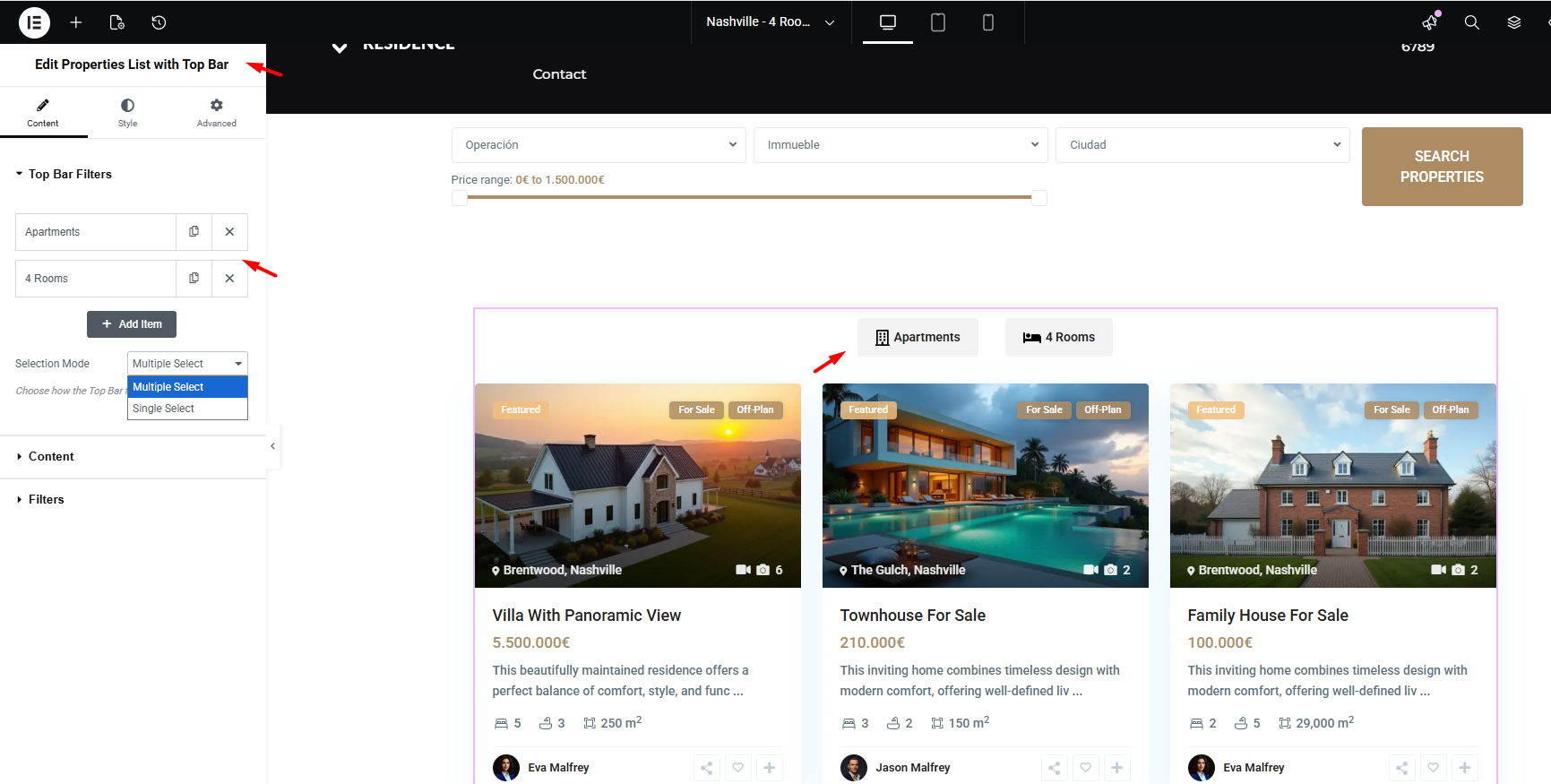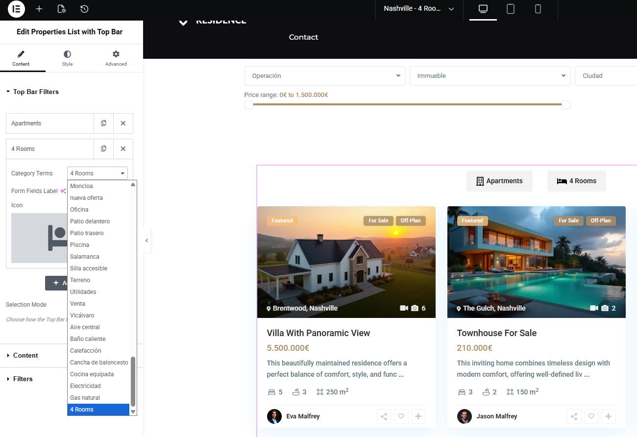 This guide explains how to use the Properties List with Top Bar widget in Elementor.