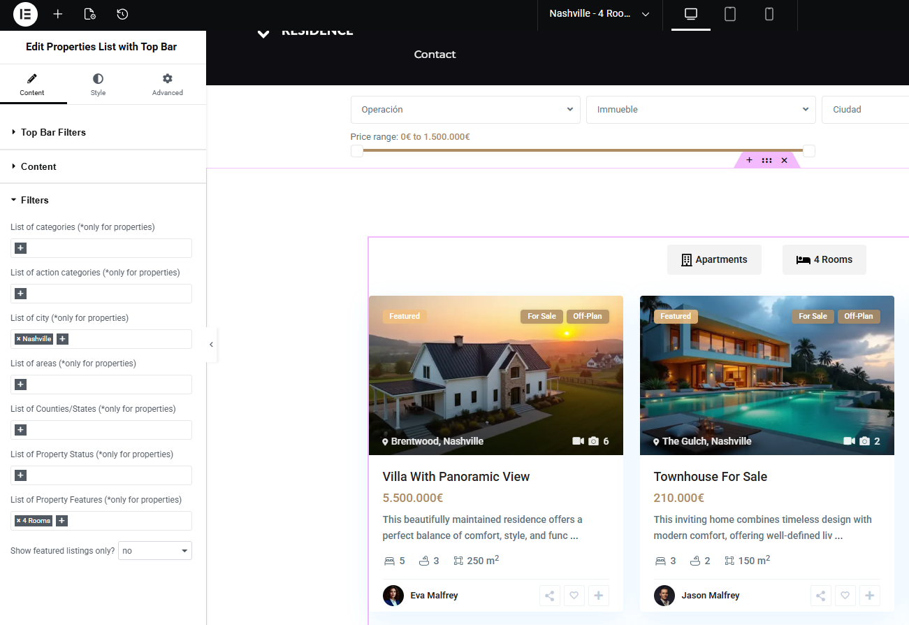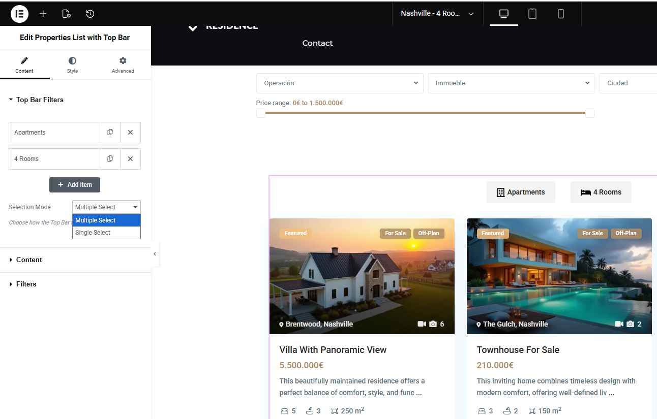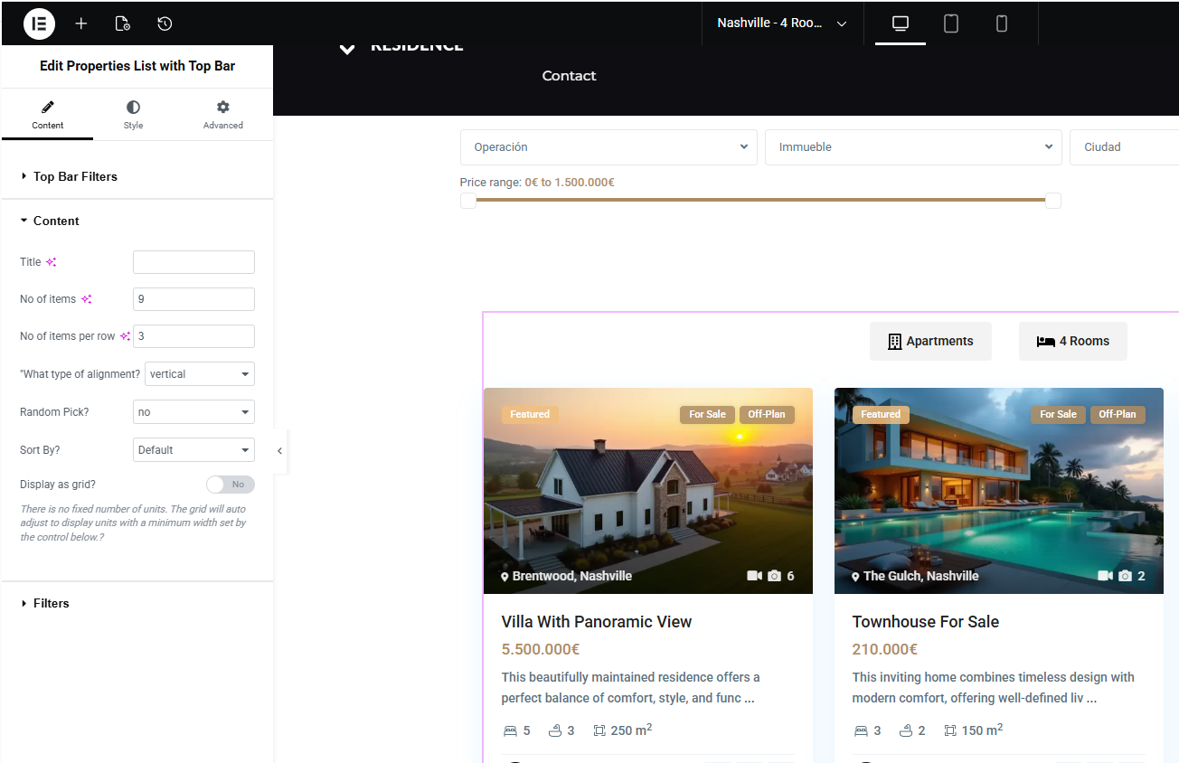 The Properties List with Top Bar widget is designed for curated, controlled listing pages. It gives you full editorial control over which properties appear and how users interact with them.