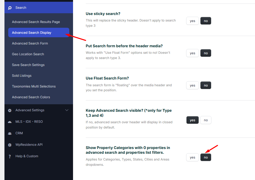 To enable the option to show categories with 0 properties in Advanced Search Results and Properties List Filters from Search Settings navigate to Theme Options > Search > Advanced search display and locate the panel below on which you can find the option: