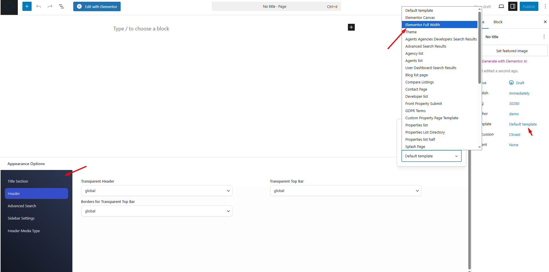 - In the page editor, locate the WpResidence Page Settings / Appearance Options section