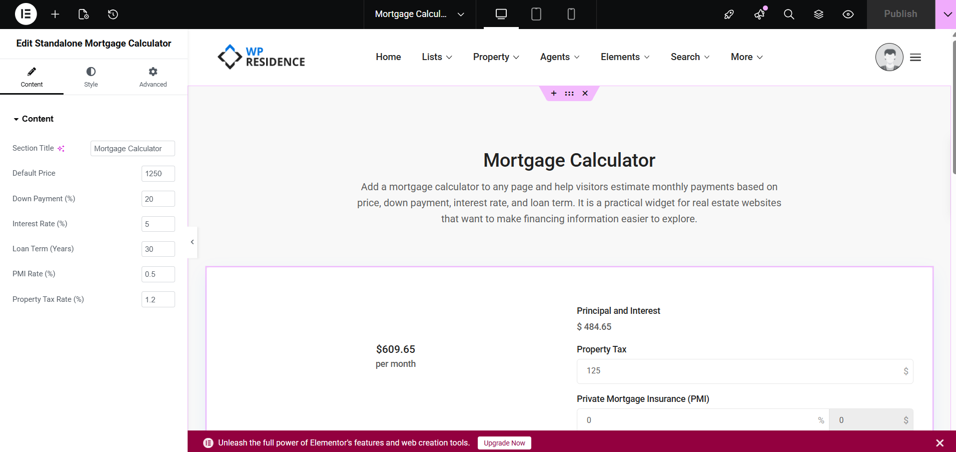 The Standalone Mortgage Calculator is an Elementor widget that lets you add a mortgage calculator to any page, not only to single property pages.