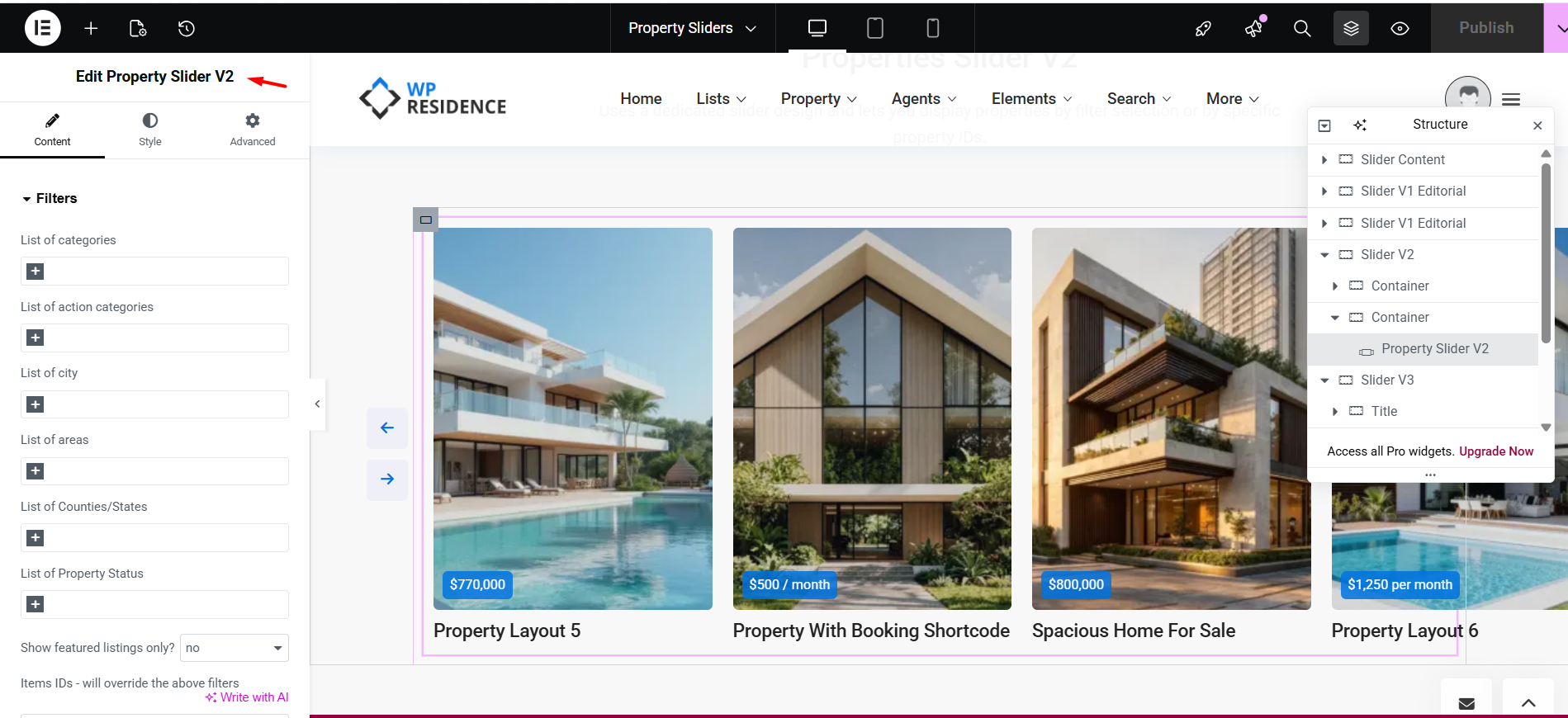 - Add the Property Slider V2 widget to the page.