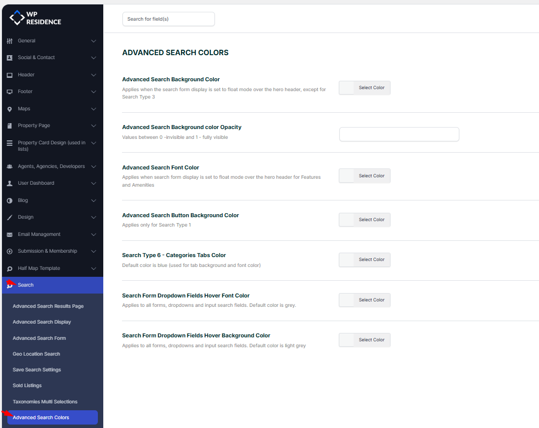 You can find these settings in: WPResidence → Search → Advanced Search Colors
