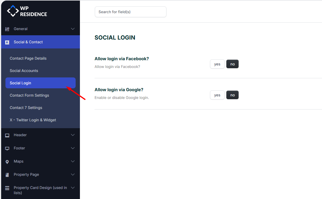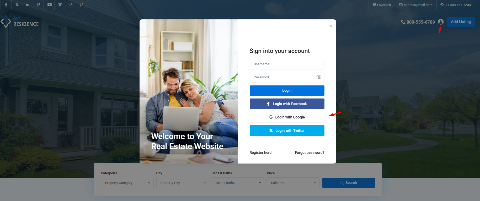 In Theme Options > Social & Contact > Social Login, you can enable Facebook and Google login.