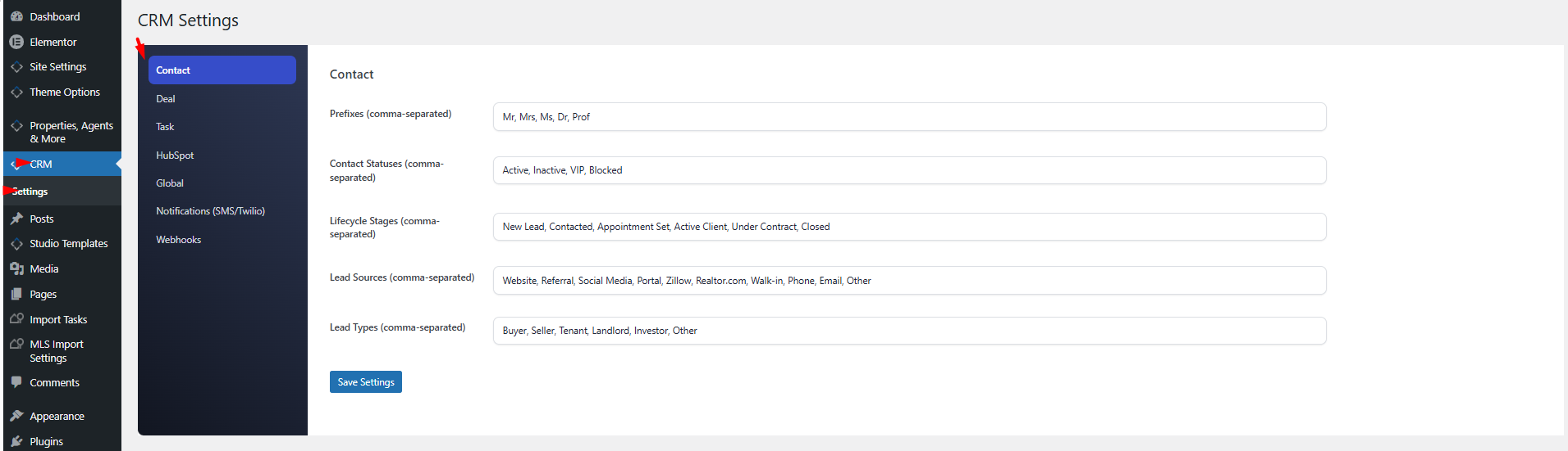 Open WordPress Admin → WPEstate CRM → Settings. Access requires the manage_options capability.