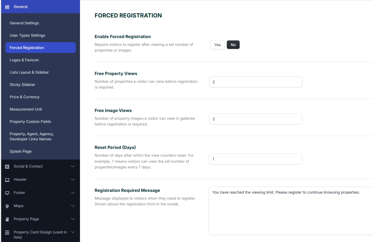 When enabled, visitors can browse only the number of properties and images allowed by your settings. After they reach that limit, the theme will require registration before they can continue.