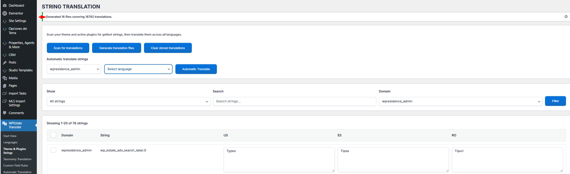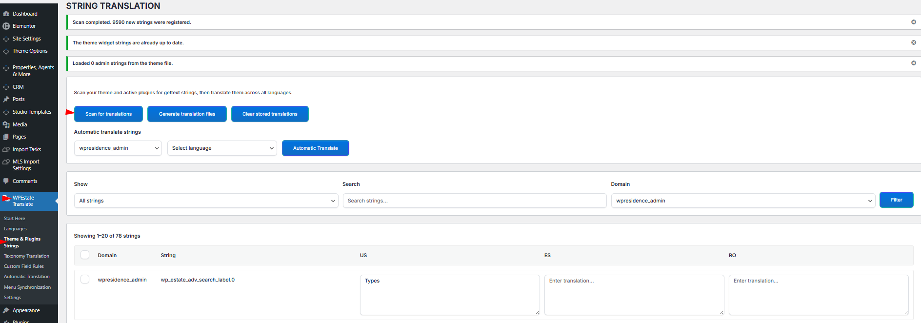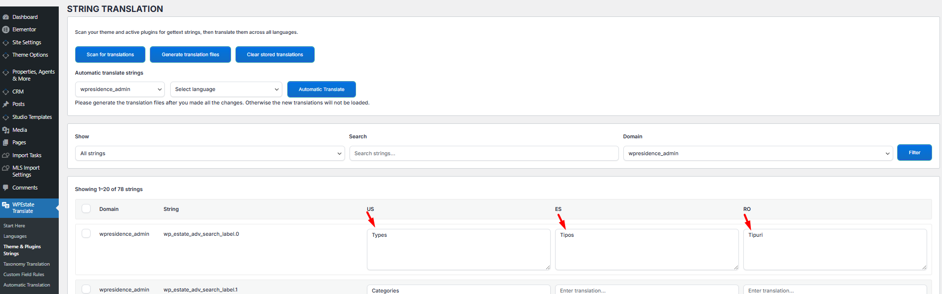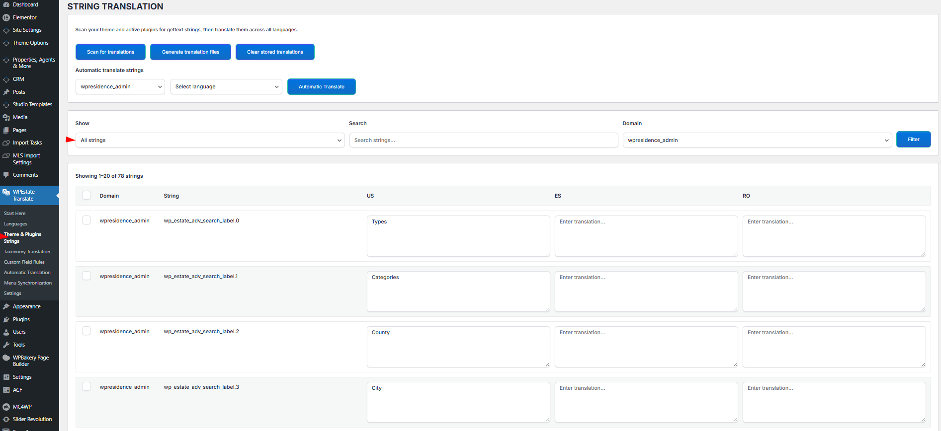 In wp-admin go to WPEstate Translate → Theme & Plugins Strings. The page is called String Translation. It lists every translatable string the plugin has discovered, grouped by domain (theme, parent theme, or a specific plugin), with one column per active language.
