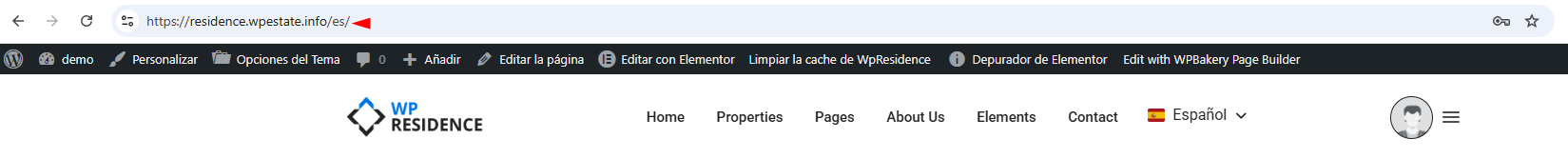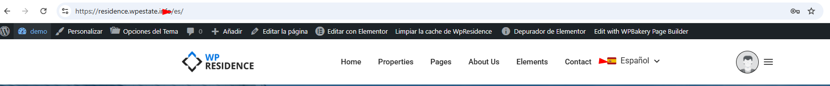 Menu links, widget links, Elementor buttons, the WPResidence search form, and the agent/agency directory URLs all inherit this prefix automatically — you do not need to edit menu items per language.