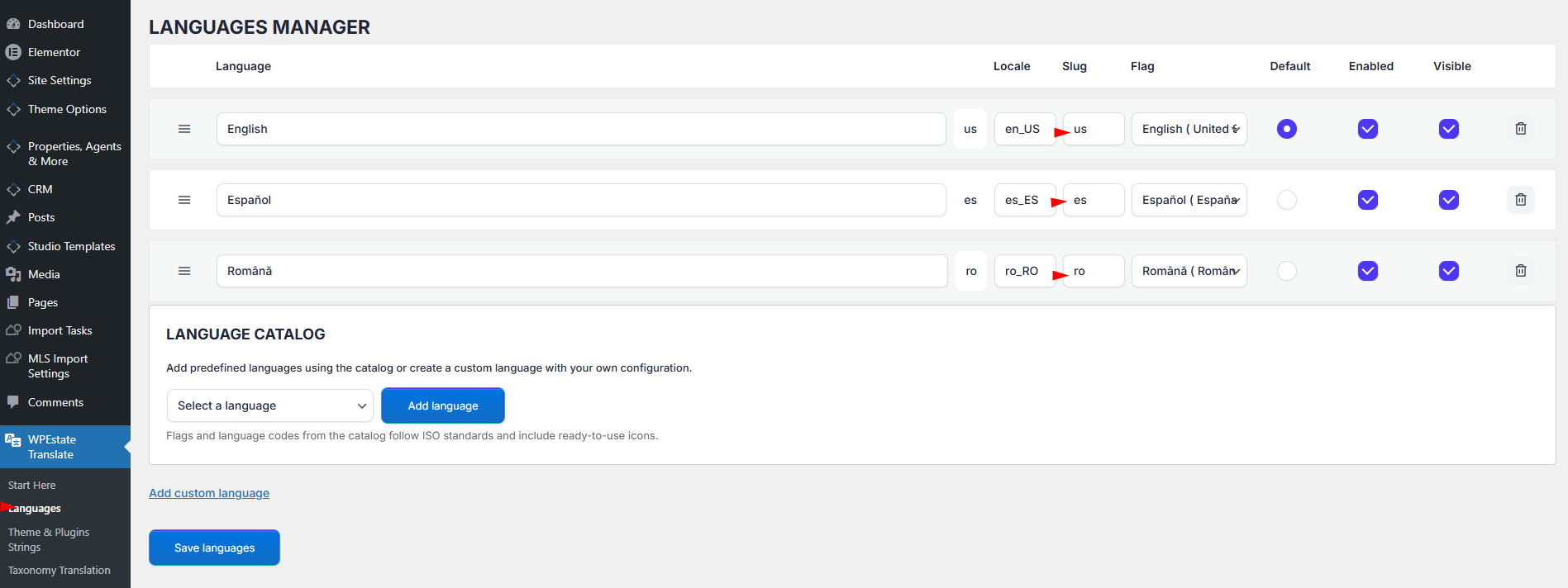 On the WPEstate Translate → Languages page each language has a slug field. That value becomes the URL prefix. Tips for picking slugs: