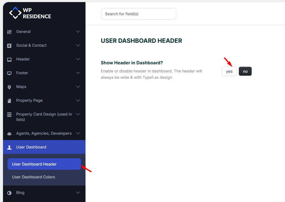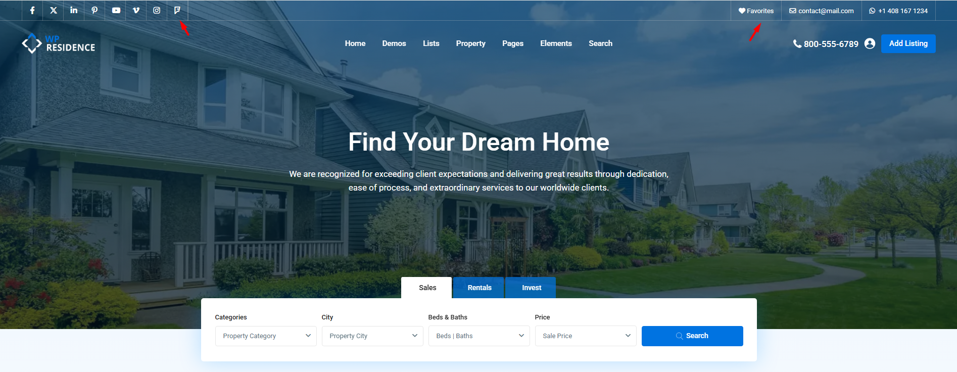 On user dashboard pages (Profile, Properties, Add Property, Inbox, Messages), you can add different top bar widgets.